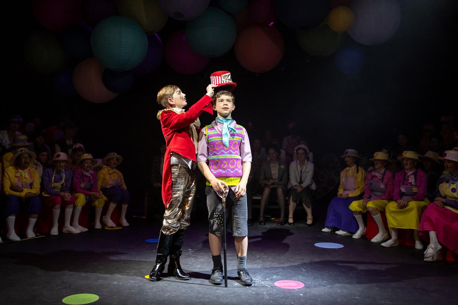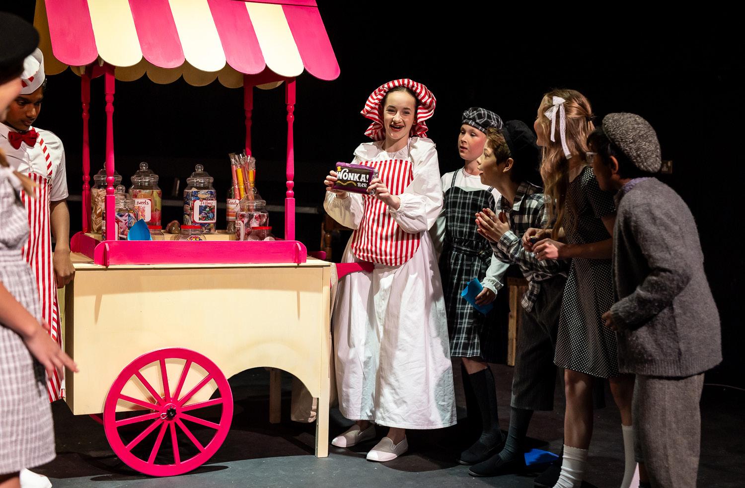 The audience was transported into the whacky world of Willy Wonka’s chocolate factory, where astonishing events occurred, as a chocolate river (and life lessons!) flowed in abundance. The set featured a striking collection of large spheres, offering a fabulous burst of colour, and a delightful sweet-stall, with the overall design allowing a sharp contrast with the Bucket family’s humble home. The costumes were a visual feast, ranging from confectionery related clothing for Wonka’s workers, to martial arts-based styling for the set of squirrels, and the glorious goose puppets, adding to the whole spectacle. The fluid scene changes were accompanied by culinary-related catchy tunes, and there was a successful inclusion of selected songs, either effectively presented by the ensemble or beautifully sung by some skilful cast members.