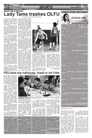 regained composure and fired another four points, 35-27. But their force wasn’t enough to out play the UAAP Season ‘74 Champion and the reigning Mighty Sports AssociationPacific Online Cup title holder as FEU’s Karen Columna shoot another lay-up with 1:40 left on the clock, pushing the lead to ten points, 37-27. The Lady Tams played their hearts out on the second canto as they put OLFU to slumber. FEU fired massive shots, making the team in the lead 24-15 with 2:01 left in the clock for the second quarter. While feeling each other out during the first quarter, it was OLFU who drew first blood 0-2 at the 7:21 mark. Supnet’s jumper marked the Lady Tams’ first basket for the quarter 5:43. Supnet, April Siat and Columna, hand in hand carried the team with combined 36 points and managed a 22-6 run in the second period. Turnovers and misses seemed to be the problem the entire game. According to Head Coach Allan Albano “Kasi hindi sila naglaro ng smart basketball, basta pasa lang ng pasa. Hindi nila alam may defense pala du’n. Wala sila sa tamang p o s i ti o n p u ro a t tempts. Pwede naman mag-extra pass (Because they did not play smart basketball, they pass the ball around without thinking about the defense, they have a lot of misses because they are not in their right position and they did not thought of passing the ball).” D u r i n g t h i s pre-season cup, Albano