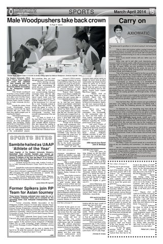Sports Bites Sambile hailed as UAAP ‘Athlete of the Year’ Team Captain of Far Eastern University Women’s Basketball Team Camille Sambile was named as University Athletic Association of the Philippines (UAAP) Season 76 Athlete of the Year last March 19 at Century Park Hotel in Vito Cruz, Manila during the annual closing ceremonies of the league. Sambile shared the honor with Judelyn Fronda of De La Salle University Women’s Chess Team in the seniors’ division. Despite the controversial meltdown of the Lady Tams due to forfeited games, Sambile won the UAAP Most Valuable Player plum in women’s caging with 81.3571 statistical points after averaging 19.7 points, 11.9 rebounds, 2.1 assists, 3.9 steals and 1.6 blocks in this year’s tournament. The 5-foot-9 forward also helped Perlas Pilipinas, the Philippine Women’s Basketball Team, clinch the silver medal in the 2013 Southeast Asian Games in Maynmar. -Lance Adrian DR. Agcaoili