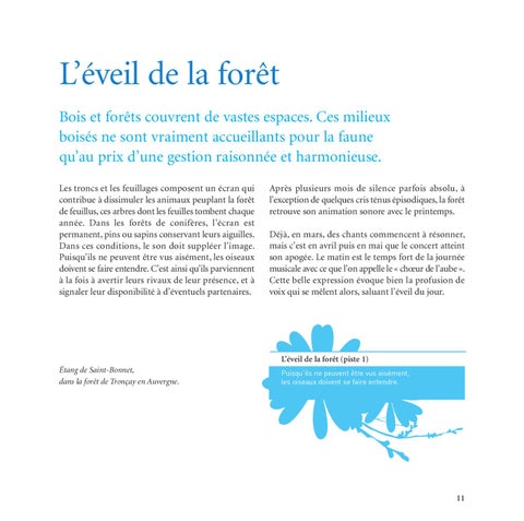 L’éveil de la forêt Bois et forêts couvrent de vastes espaces. Ces milieux boisés ne sont vraiment accueillants pour la faune qu’au prix d’une gestion raisonnée et harmonieuse. Les troncs et les feuillages composent un écran qui contribue à dissimuler les animaux peuplant la forêt de feuillus, ces arbres dont les feuilles tombent chaque année. Dans les forêts de conifères, l’écran est permanent, pins ou sapins conservant leurs aiguilles. Dans ces conditions, le son doit suppléer l’image. Puisqu’ils ne peuvent être vus aisément, les oiseaux doivent se faire entendre. C’est ainsi qu’ils parviennent à la fois à avertir leurs rivaux de leur présence, et à signaler leur disponibilité à d’éventuels partenaires.