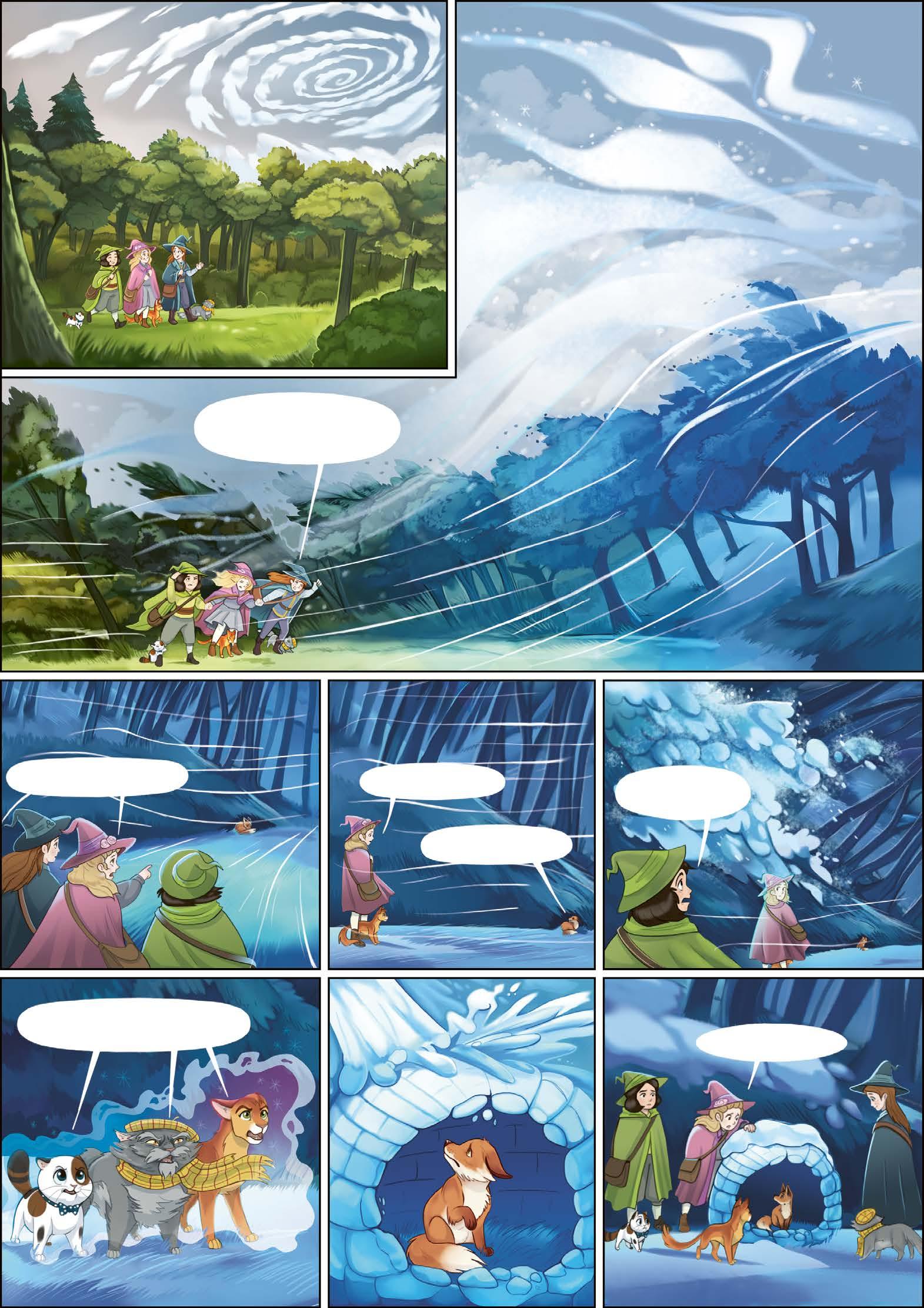 Nos trois mentors nous demandent de reculer. Je tente d’oublier mon inquiétude en rassurant le renardeau, que j’ai blotti au fond de mon chapeau afin de le soustraire au froid. Le pauvre, il n’en mène pas large, et je ressens son émotion, sa crainte, son incompréhension ! Les Chats-Sorciers se mettent à fredonner une incantation, et je sens des ondes naître autour de moi… Les branches des arbres sifflent et ploient dans notre direction, les oiseaux convergent au-dessus de notre clairière, comme poussés par un vent irrésistible…