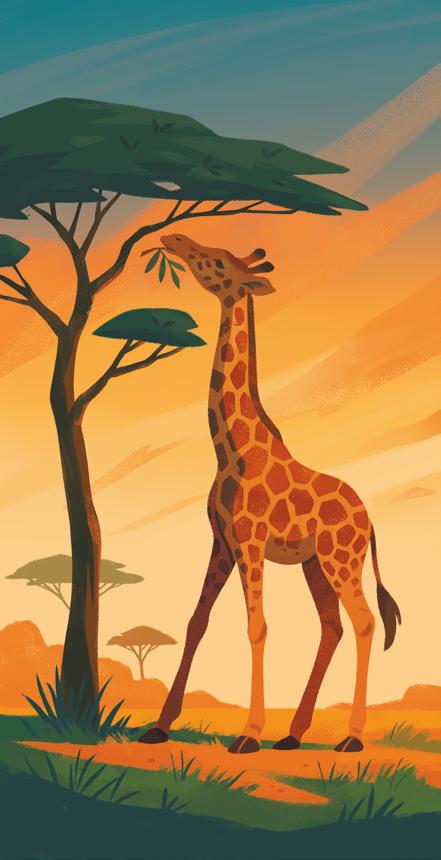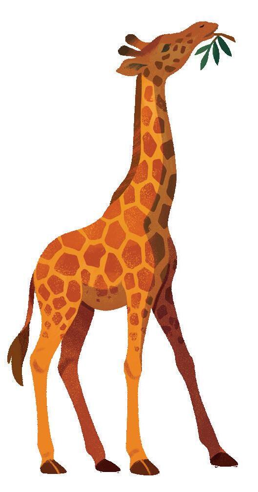 La girafe, haute d’environ 5 mètres, dépasse le toit d’une maison ! Grâce à sa longue langue de 50 centimètres, elle mange son plat favori : les feuilles d’acacia.