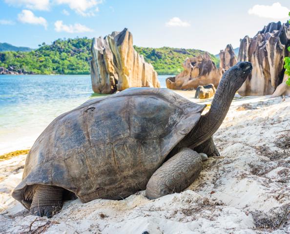 Les tortues des Seychelles atteignent les 150 ans. Et certaines 170 ans ! Ces tortues sont très grandes, environ 1,20 mètre de longueur, et très lourdes, parfois près de 300 kilos. Avec leur long cou, elles réussissent à arracher des branches d’arbres à 1 mètre de hauteur !