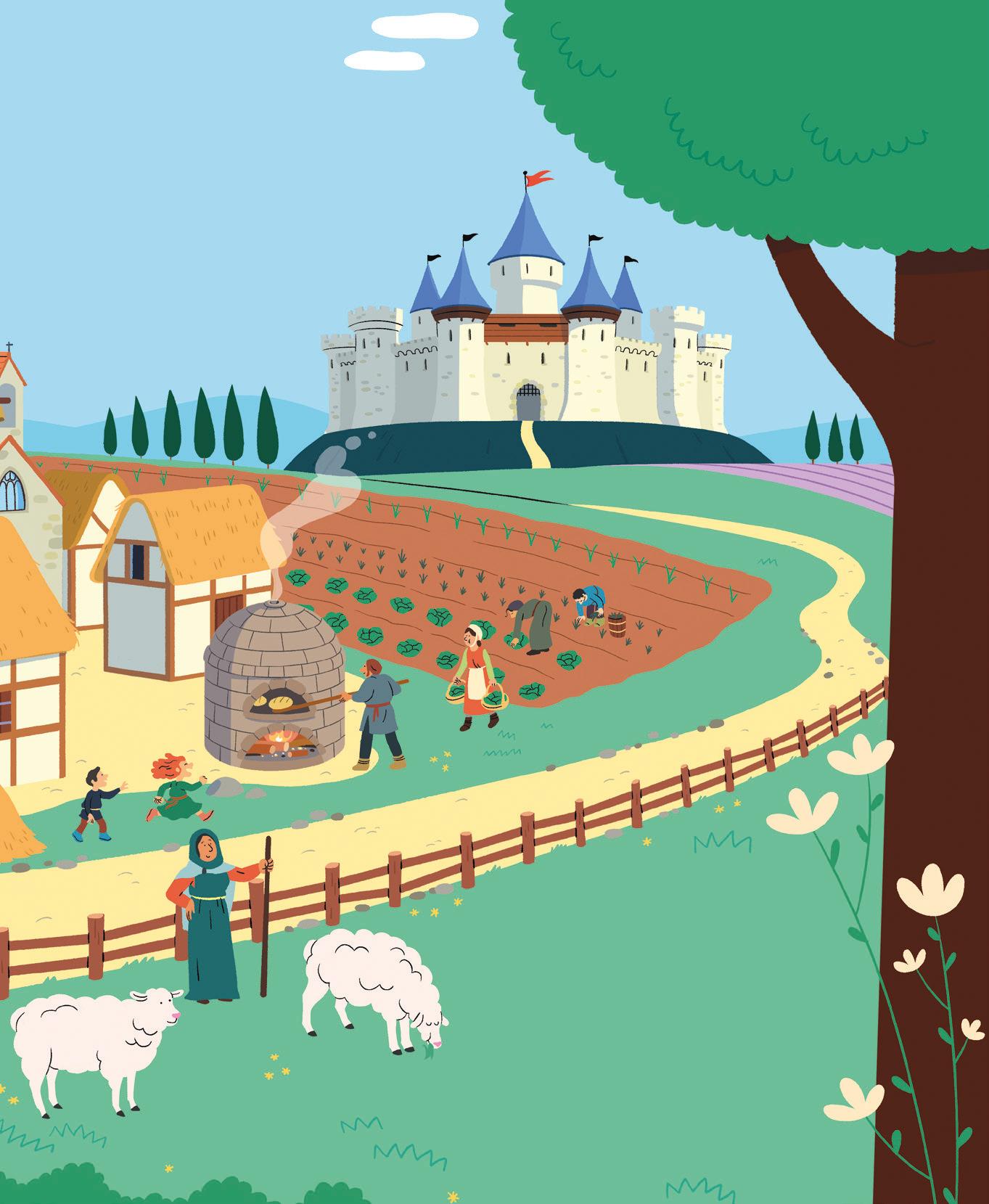 Le suzerain cède une partie de son vaste domaine aux paysans qui vivent et travaillent sur ses terres : les serfs. En échange de ces terres et de la protection du seigneur, les serfs donnent à ce dernier une partie de leurs récoltes. Ils payent aussi des taxes pour l’utilisation du four, du moulin ou du pressoir du domaine.