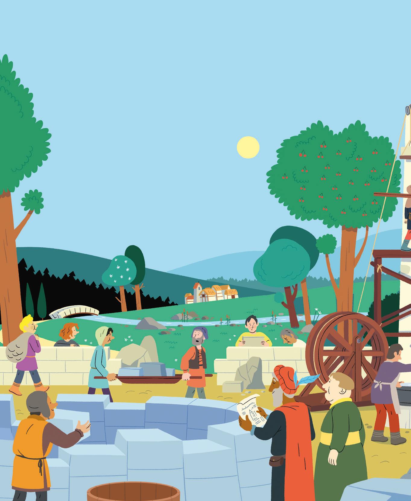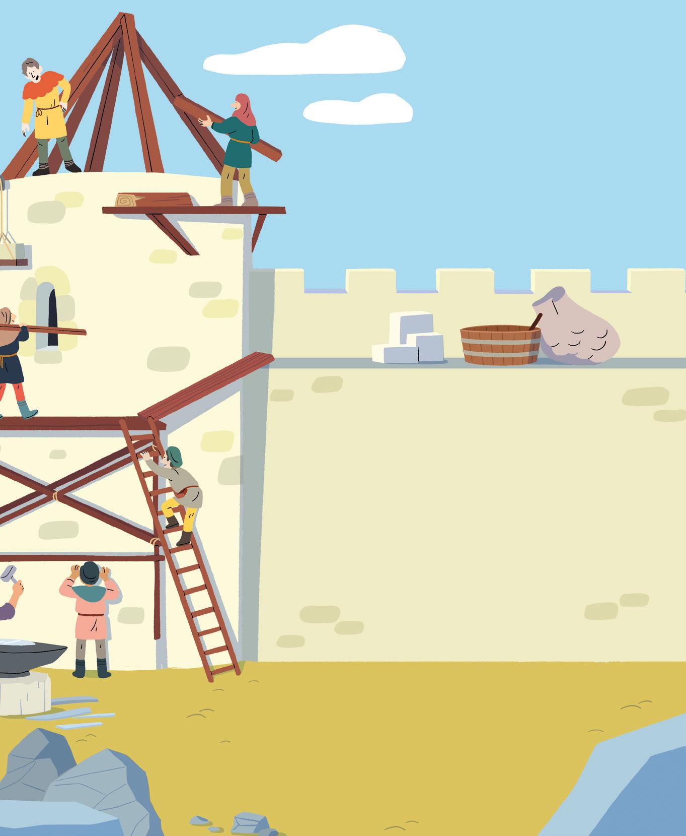 La construction d’un château fort nécessite la présence de nombreux artisans spécialisés : carriers, tailleurs de pierre, maçons, charpentiers... Des femmes travaillent aussi sur les chantiers. Elles portent des blocs de pierre, creusent des fossés, préparent le mortier ou montent les échafaudages.