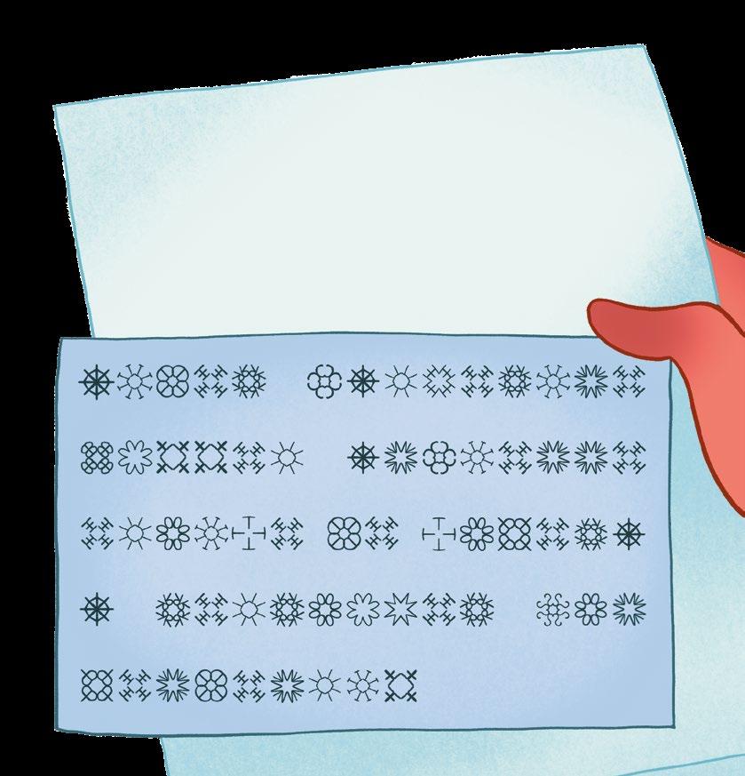 En tous cas, ils ont échangé leurs indices, ce qui leur a permis de comprendre comment décrypter le code du sujet. En associant la forme de l’étoile à l’indice que lui a donné l’apprentie-détective, ils ont déduit que chaque symbole est en fait constitué d’une lettre démultipliée selon l’axe de symétrie donné par la forme de l’étoile.