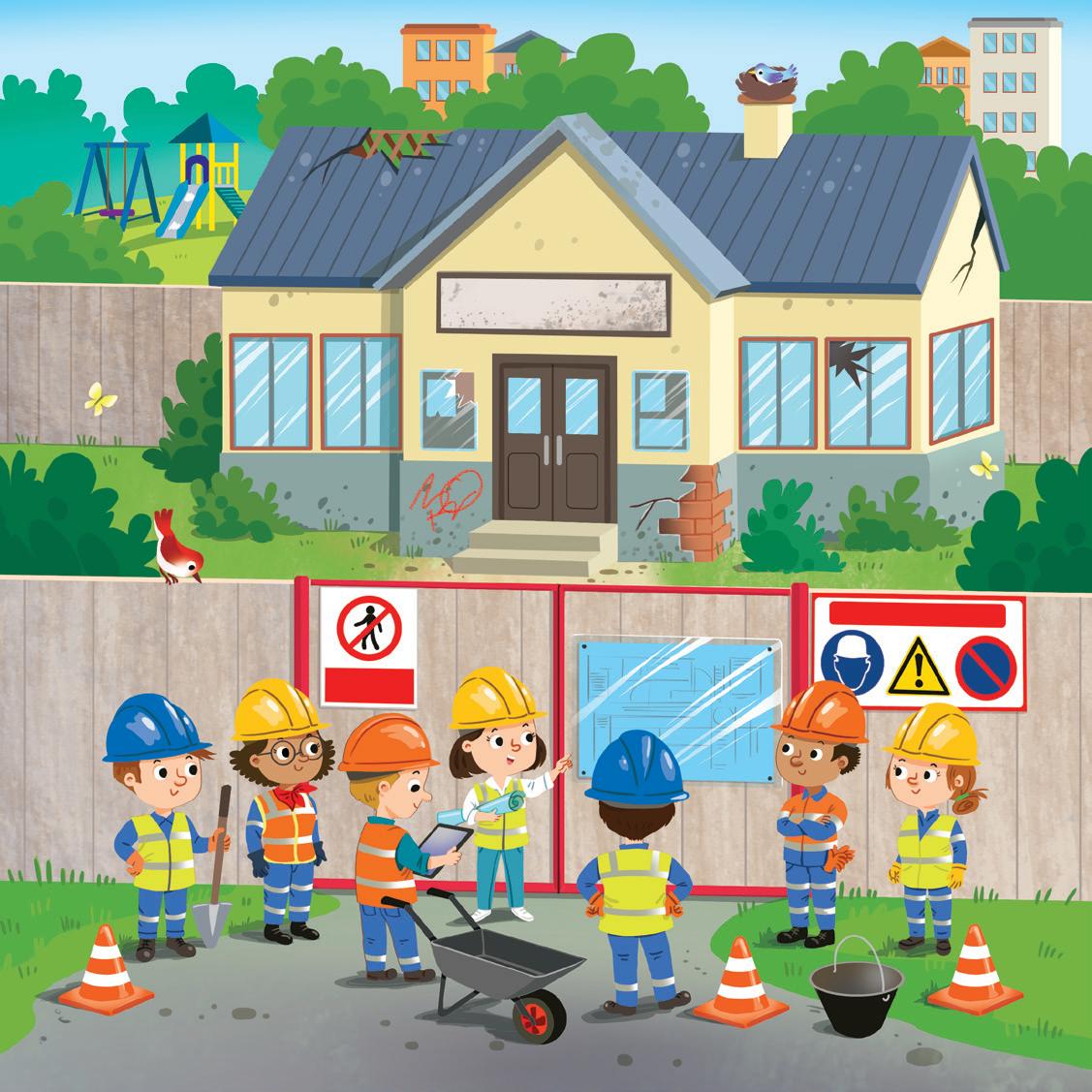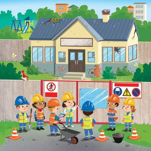 Quand un chantier démarre, l’architecte réunit les artisans pour leur montrer les plans qu’il a dessinés. Il a imaginé une nouvelle construction qui sera solide, pratique et belle bien sûr.