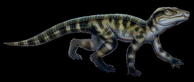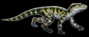 Ce crocodilien terrestre (Protosuchus, -195 Ma) chasse de petits animaux en se servant de ses canines pointues. Et, s’il en a l’occasion, il n’est pas contre un ou deux œufs de dinosaures.