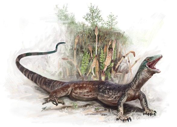 Avec ses dents recourbées comme celles des pythons, Breugnathair chasse de petits reptiles, des mammifères et de jeunes dinosaures. Long de 41 cm, il compte parmi les plus grands reptiles de son milieu !