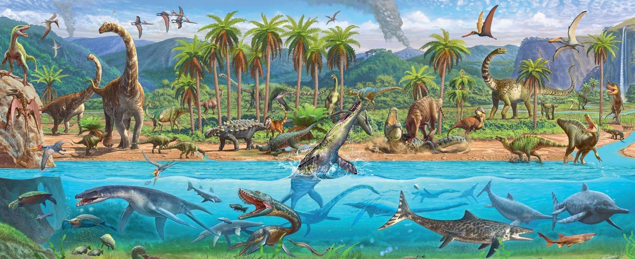Les dinosaures, eux, profitent des espaces laissés libres par l’extinction pour se développer. C’est le début d’une période de prospérité : insectes, poissons, reptiles… Un foisonnement de formes de vie réinvestit la terre, la mer et le ciel.