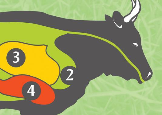Au pré, la vache broute de l’herbe en arrachant des brins avec sa langue et en les avalant sans trop les mâcher. Cette herbe va se retrouver dans son premier estomac, le rumen (ou la panse) où elle est stockée et humidifiée par la salive. Des petites boules de ce mélange remontent alors dans sa bouche où elles sont mastiquées longuement, puis de nouveau avalées plusieurs fois de suite. On appelle ce cycle la rumination et il peut durer jusqu’à 12 heures par jour. Une fois l’herbe réduite en de fines particules, le bol alimentaire descend vers les trois autres estomacs pour poursuivre la digestion.