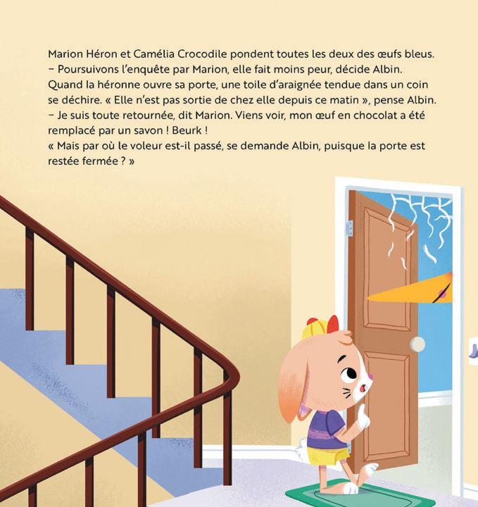 « Réfléchis », pense Albin Lapin. Ce matin, après la chasse aux œufs, chacun est rentré chez lui et depuis, personne n’est sorti de l’immeuble, personne n’y est entré. Il en est sûr car il habite au rez-de-chaussée, face à la porte principale. Donc, le gredin qui a volé son œuf ne peut être que l’un de ses voisins : Simon Caneton, Marion Héron, Camélia Crocodile, Dorothée Pingouin ou Émile Souris.
