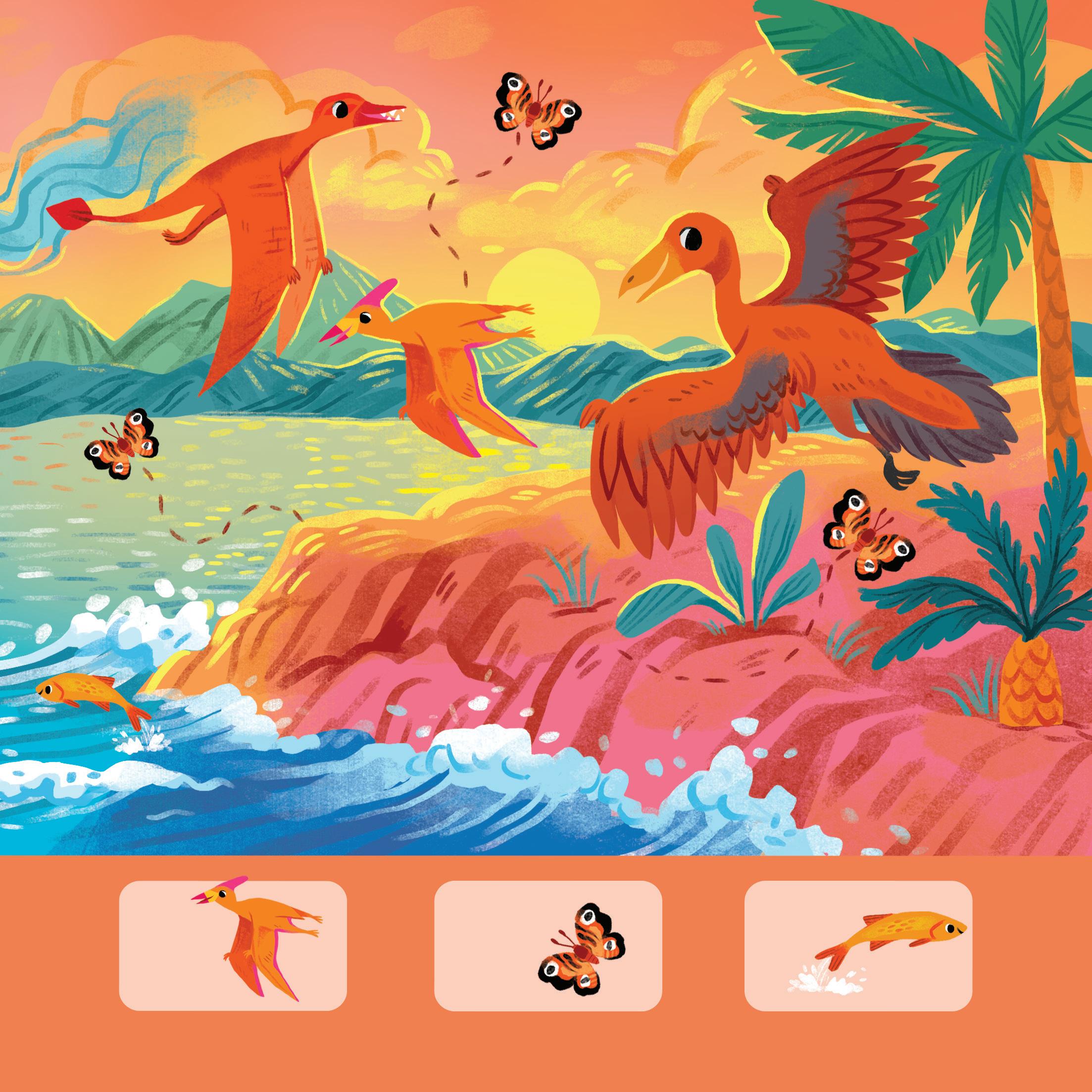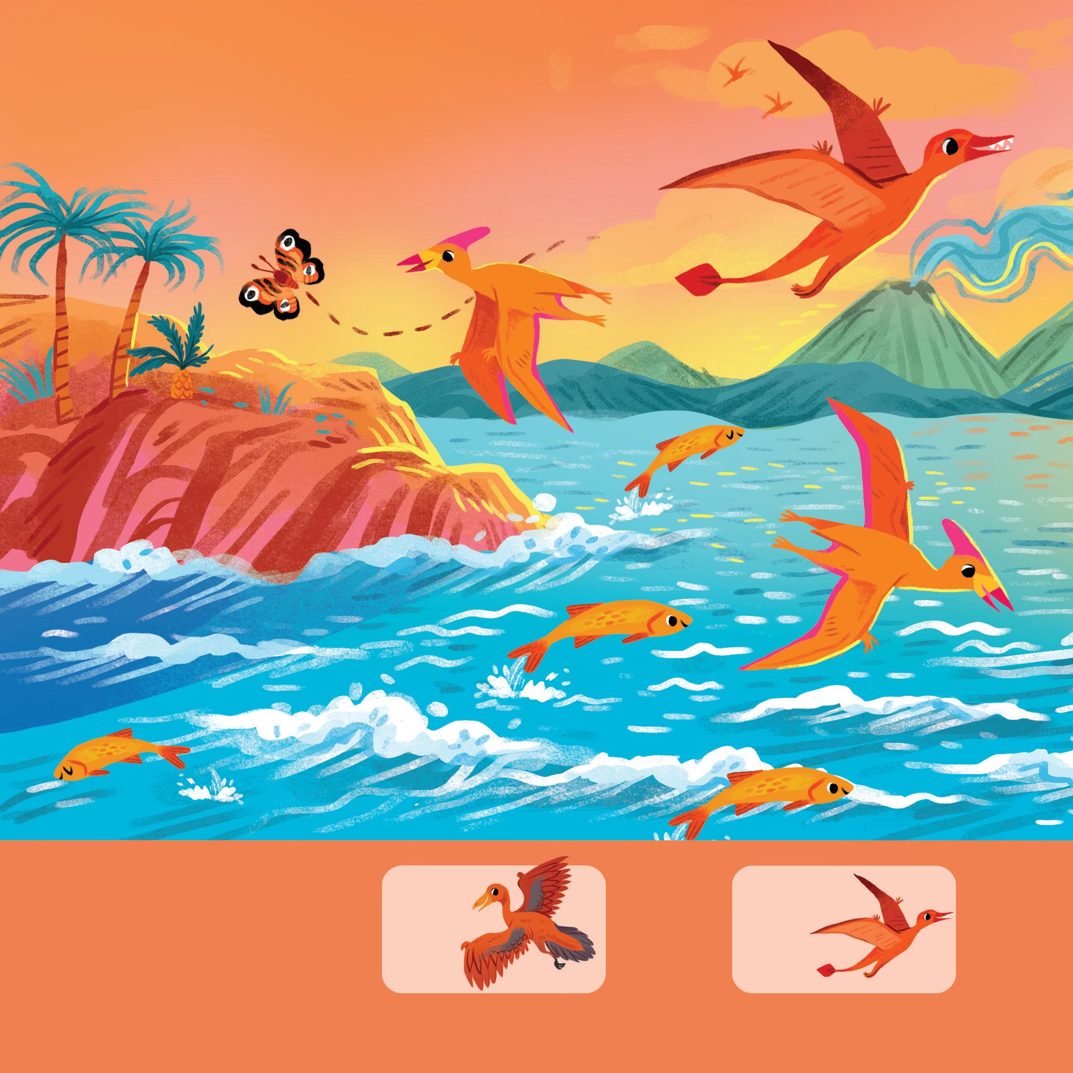 J’aperçois un archéoptéryx orange ! Il vole au-dessus de l’océan, à la recherche d’un poisson à attraper.