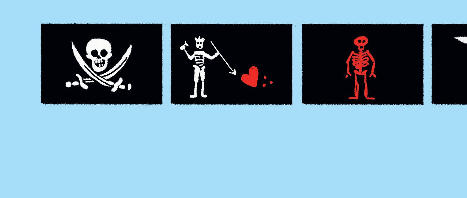 Chaque bateau pirate possède son propre pavillon, un drapeau souvent noir ou rouge avec une tête de mort, des os ou des armes, parfois des cœurs. Les pirates le dressent à l’avant du navire pour effrayer leurs ennemis. Ils s’emparent aussi des pavillons des bateaux qu’ils attaquent.