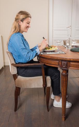 Pour être bien installé à table pour manger, commencez par vous asseoir au fond de votre chaise, puis redressezvous et basculez votre bassin en arrière de manière à bien vous positionner sur vos ischions. De cette façon, la colonne vertébrale est alignée. Les genoux doivent être au même niveau que votre bassin, et les pieds bien à plat sur le sol. Relâchez vos épaules. Vos coudes doivent être positionnés à 90 degrés et vos avant-bras posés sur la table.