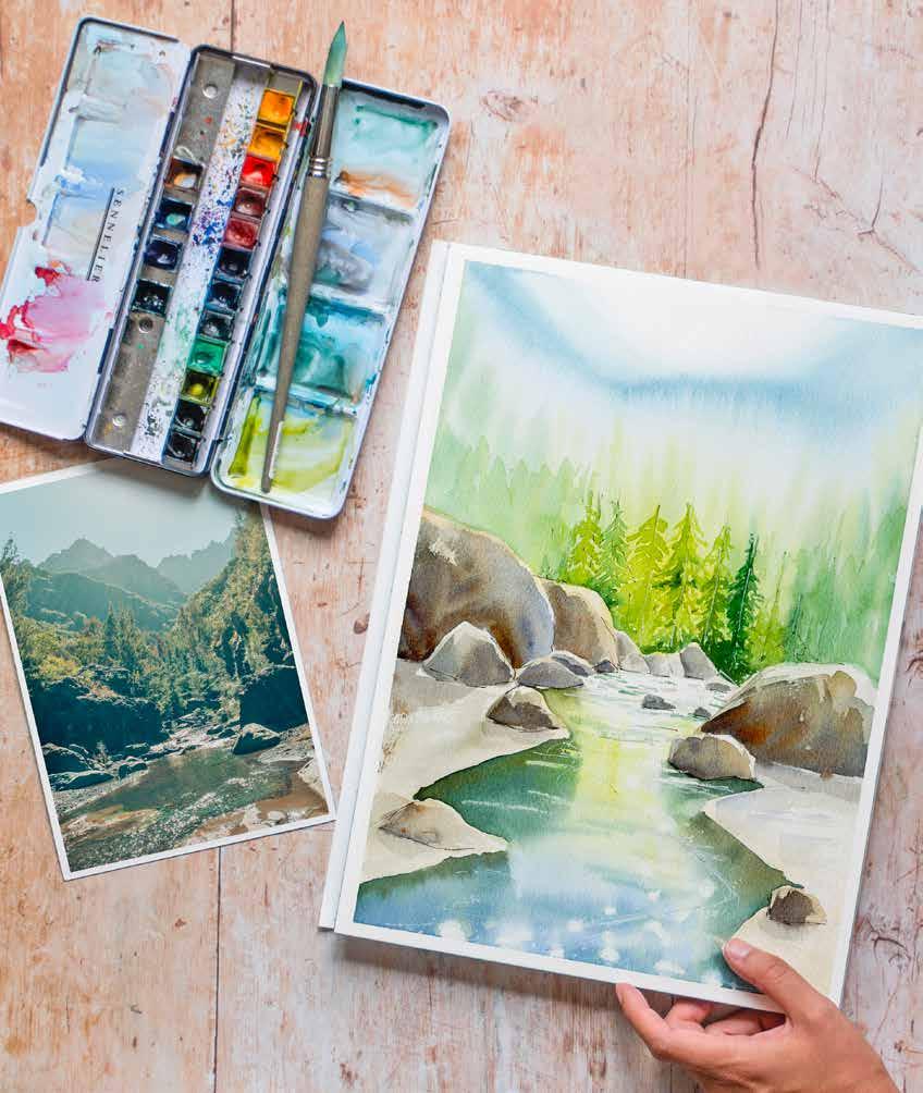 Zoom sur la référenceReprésenter un paysage à l’aquarelle peut sembler un défi difficile à relever : par où commencer ? Quels sont les éléments-clés d’une peinture réussie ? Comment interpréter une photo de paysage sans perdre ce qui fait l’attrait du modèle ?