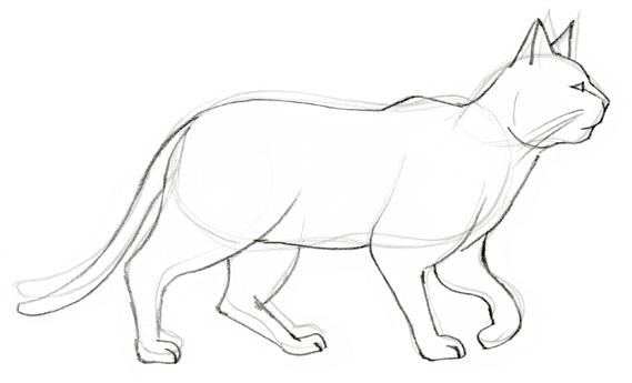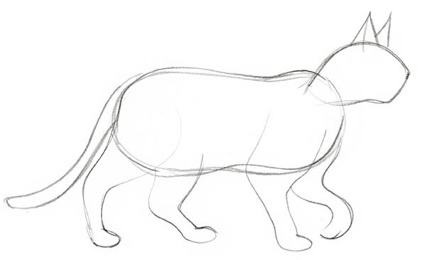 Quelle que soit sa position, le chat présente un volume plus important dans le bas du dos. La tête est assez petite, ronde, et le museau à peine pointu. La queue apporte de l’expression, ainsi que l’orientation des oreilles. Les pattes sont tordues à l’inverse de nos jambes. Le genou semble se plier vers l’arrière.