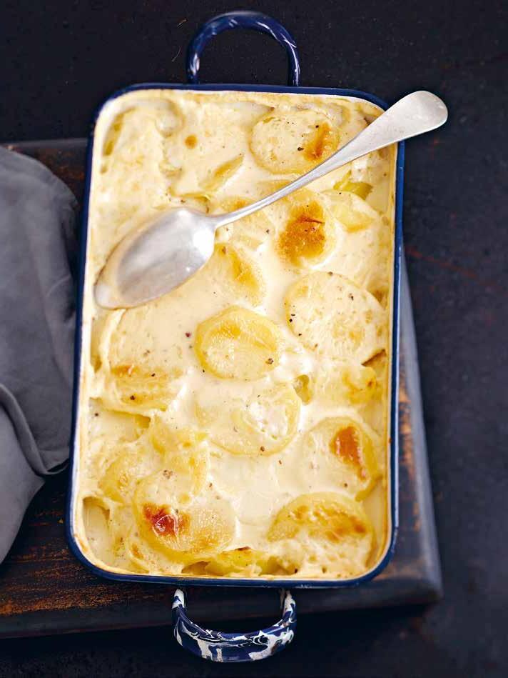 • Récupérez les pommes de terre à l’aide d’une écumoire et déposez-les dans un plat à gratin. Couvrez avec le mélange lait-crème de cuisson.