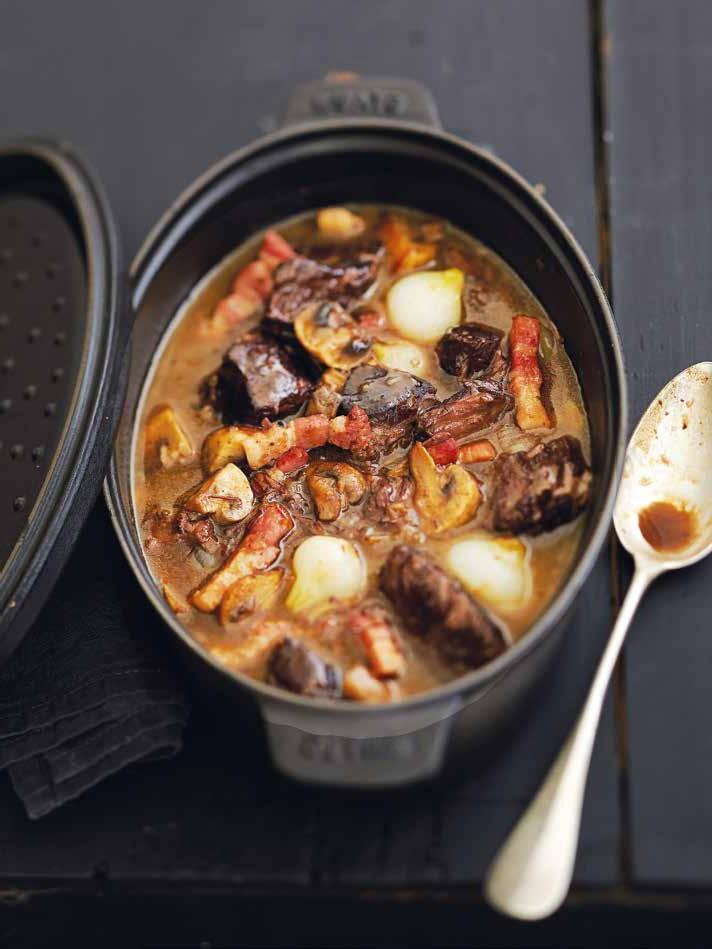 • Après 1 h 30 de cuisson de la viande, vérifiez l’assaisonnement puis ajoutez dans la cocotte les petits oignons, les lardons et les champignons. Laissez cuire encore 45 minutes à couvert sur feu doux en mélangeant régulièrement. Dégustez le bourguignon bien chaud avec des pommes de terre vapeur.