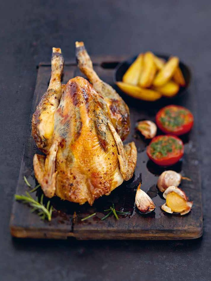 • Déposez le poulet dans un plat à rôtir. Salez et poivrez légèrement l’extérieur et arrosez-le d’huile d’olive. Enfournez le plat et allumez le four à 160 °C (th. 5-6). Faites cuire le poulet 1 h 30 à 1 h 45 en l’arrosant et en le retournant d’un quart de tour toutes les 20 minutes environ. Sortez-le du four (le jus qui s’écoule de l’intérieur doit être limpide et non rouge). Couvrez-le de papier d’aluminium et laissez-le reposer 15 minutes avant de le couper en morceaux.