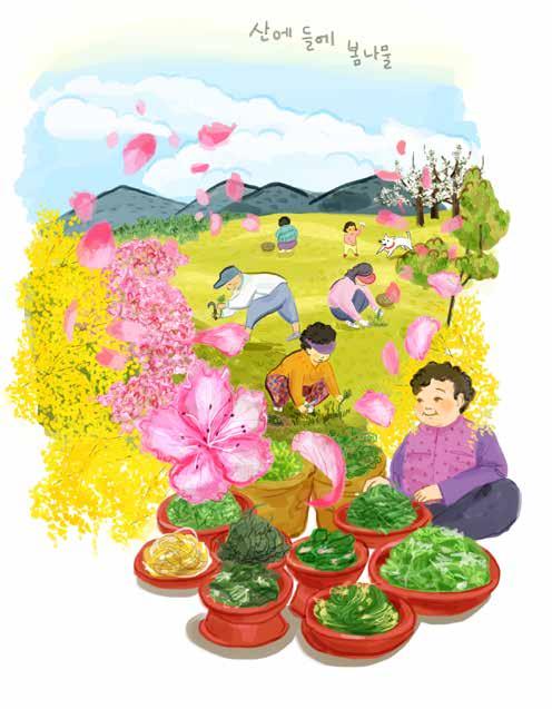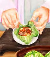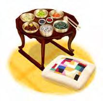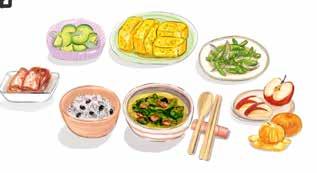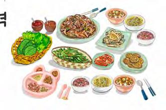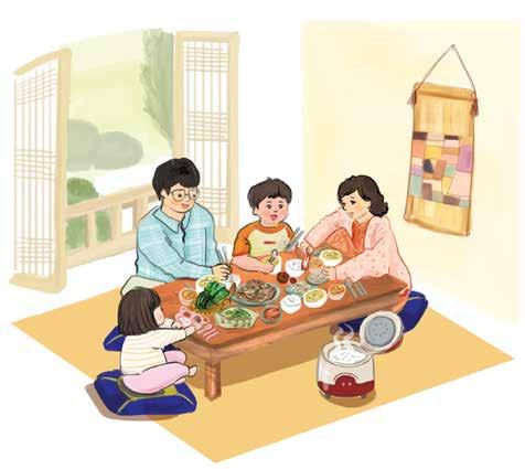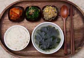 Riz aux céréales, soupe de pousses de soja, kimchi de chou, kimchi à l’eau, bulgogi, laitue et feuilles de pérille, déclinaisons de sauces (à base de pâte de soja fermenté), salade de ciboule, confit de racine de lotus, namul de champignons, composent un menu typique en Corée. Le dîner se déroule le plus souvent en famille, même si celleci est rarement complètement réunie en milieu citadin, car généralement les deux parents travaillent et les enfants suivent des cours particuliers jusqu’à tard dans la soirée.