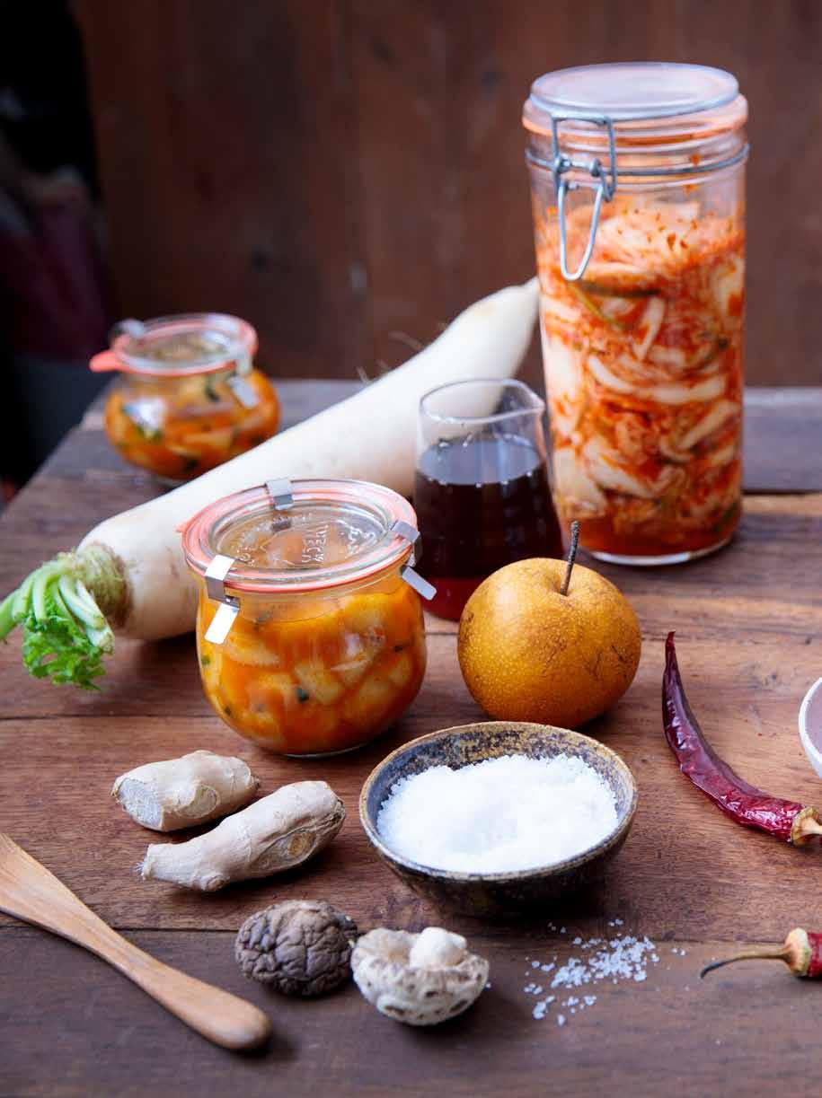 l’Eurasie, s’investissait dans le continent au cours de son histoire. C’est probablement en Mandchourie, à la fois terre de l’ancien royaume coréen et région originaire du soja, que les Coréens ont fondé le pilier de leur cuisine : le goût du soja fermenté. Les aliments fermentés sont depuis toujours considérés comme les produits les plus importants dans la gastronomie du pays.