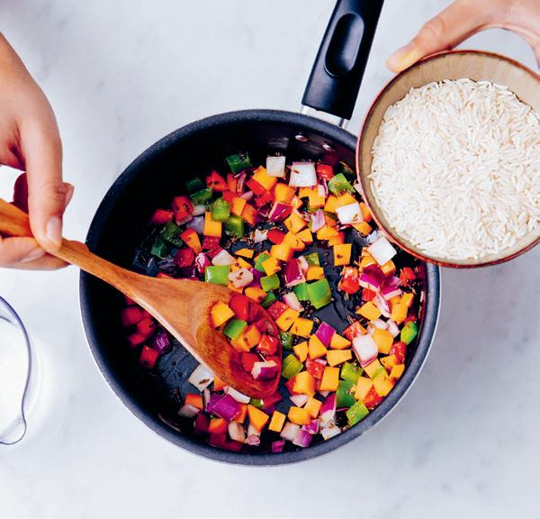 Ajoutez la pâte de gingembre, le riz et les cubes de légumes. Salez et faites revenir 2 à 3 minutes.