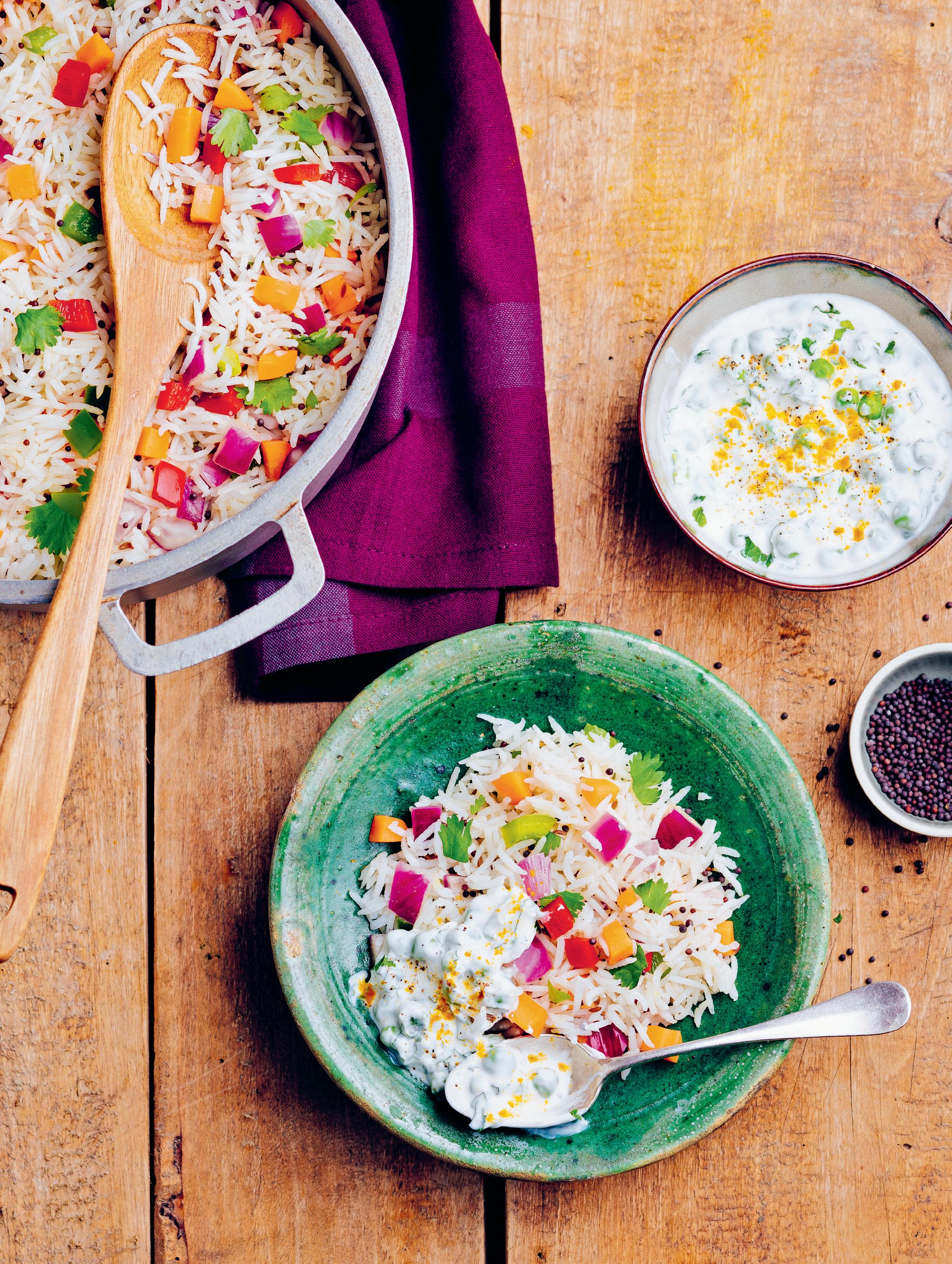 Laissez reposer pendant 10 minutes sans ouvrir et servez aussitôt avec un raita de votre choix (voir recettes p. 64).