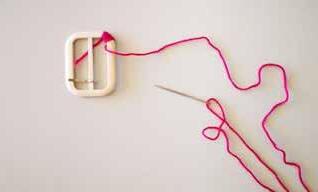 4. Pour la boucle de ceinture, il est possible de trouver une boucle de ceinture recouverte assortie, certaines merceries proposent aussi parfois de faire recouvrir la boucle par le tissu de son choix. Dans cet exemple, une boucle de ceinture classique a été recouverte par un fil de laine assorti au tissu de la ceinture, simplement enroulé autour de la boucle.