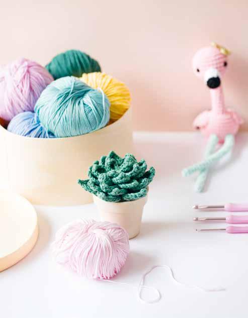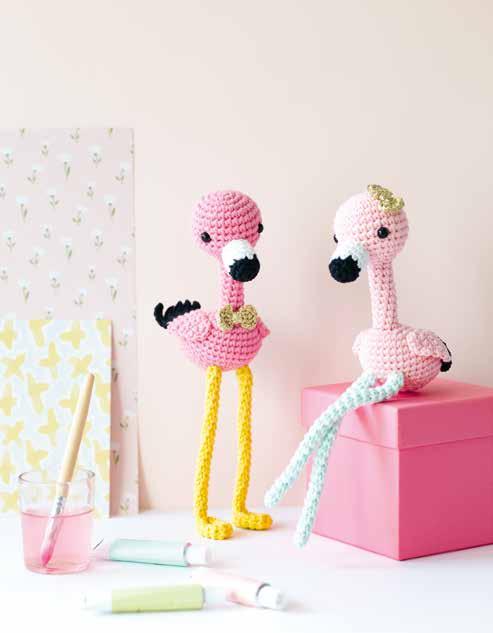 Vous trouverez dans ce coffret les coloris et quantité de laine nécessaires pour réaliser le flamant rose. Libre à vous de reproduire ensuite ce patron avec la laine de votre choix. Les modèles pages 12 et 21 ont été réalisés avec un crochet de 3 mm et le fil Natura Just Cotton Medium de DMC (50 g–75 m). N’hésitez pas à essayer également ce patron avec un fil de coton plus fin, comme le Happy Cotton de DMC, à crocheter en 2,25 mm. Cela vous donnera un flamant d’environ 18 cm de haut.