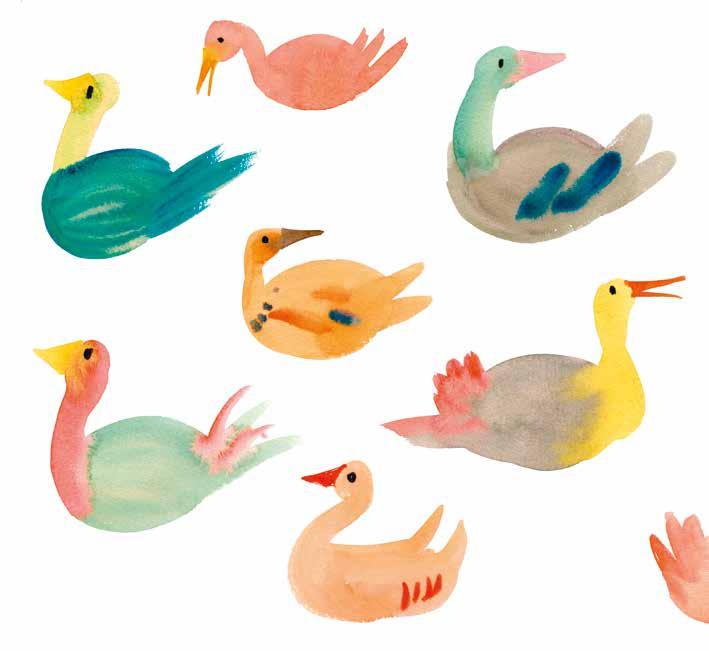 Tu peux peindre des canards avec des plumes et des becs de toutes les couleurs.