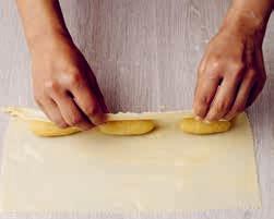 Posez un boudin d’amandes sur le rectangle obtenu, puis recouvrez-le de pâte ; ces cornes de gazelle n’auront pas la forme arrondie des cornes de gazelle classiques. Découpez le pourtour à l’aide d’une roulette à pâtisserie ou d’un couteau. Renouvelez l’opération jusqu’à épuisement des boudins d’amandes. Déposez les cornes de gazelle sur une plaque allant au four recouverte de papier cuisson, puis laissez reposer toute la nuit.