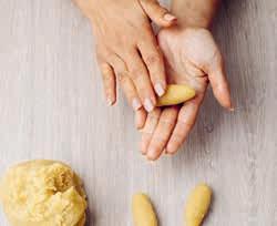 Confectionnez la garniture en mixant très finement les amandes avec le sucre. Mettez cette pâte d’amandes dans un saladier avec la cannelle, le beurre et l’eau de fleur d’oranger. Malaxez afin d’obtenir une pâte homogène. Prélevez des morceaux de pâte d’amandes et formez des petits boudins de 5 cm de longueur environ. À l’aide d’un rouleau à pâtisserie, étalez très finement une boule de pâte à cornes de gazelle en formant un rectangle.