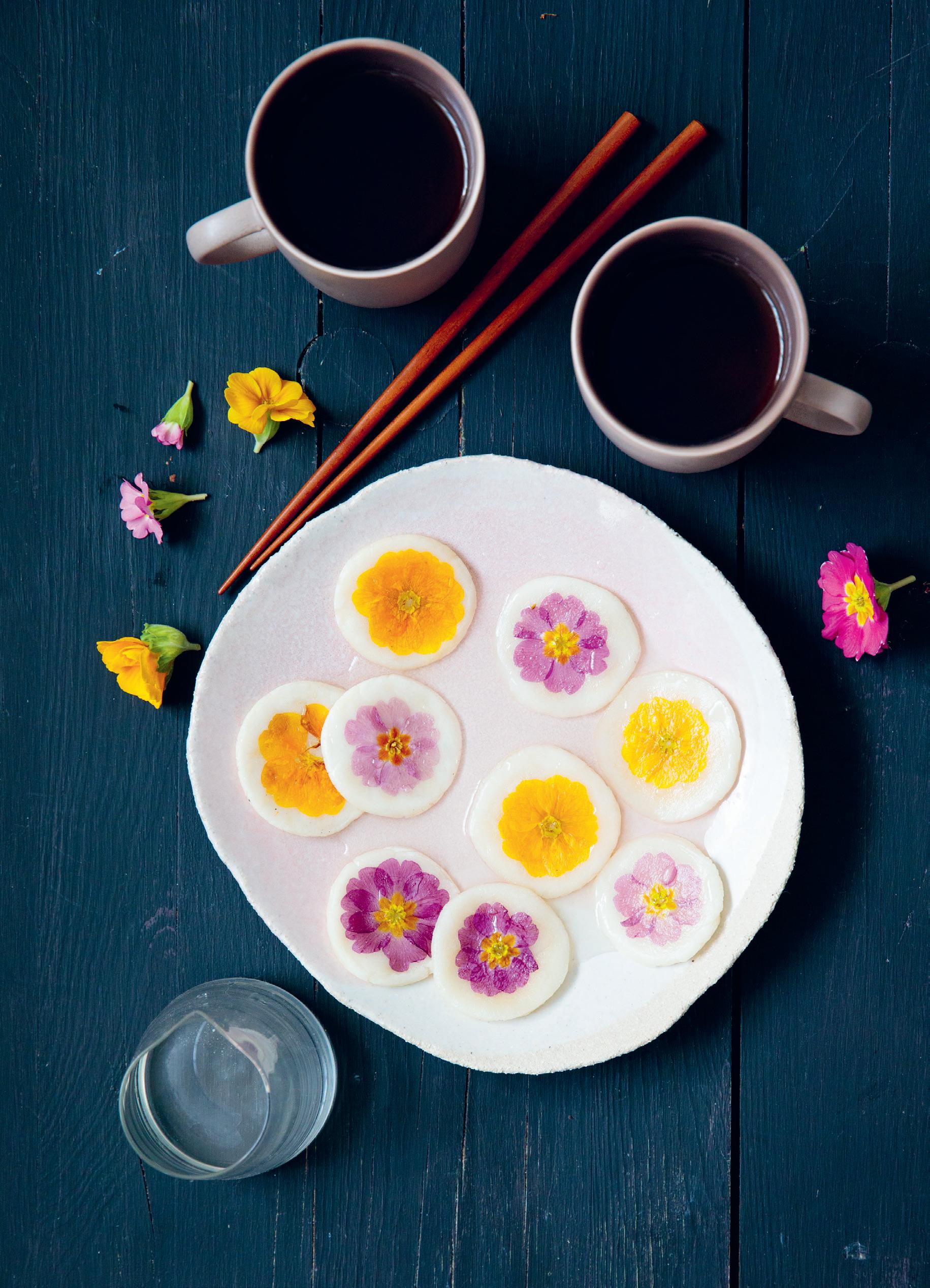 Dans la recette d’origine, on utilise l’azalée (Rhododendron mucronulatum) au printemps et le chrysanthème (Chrysanthemum boreale) en automne.