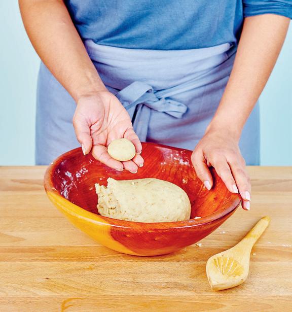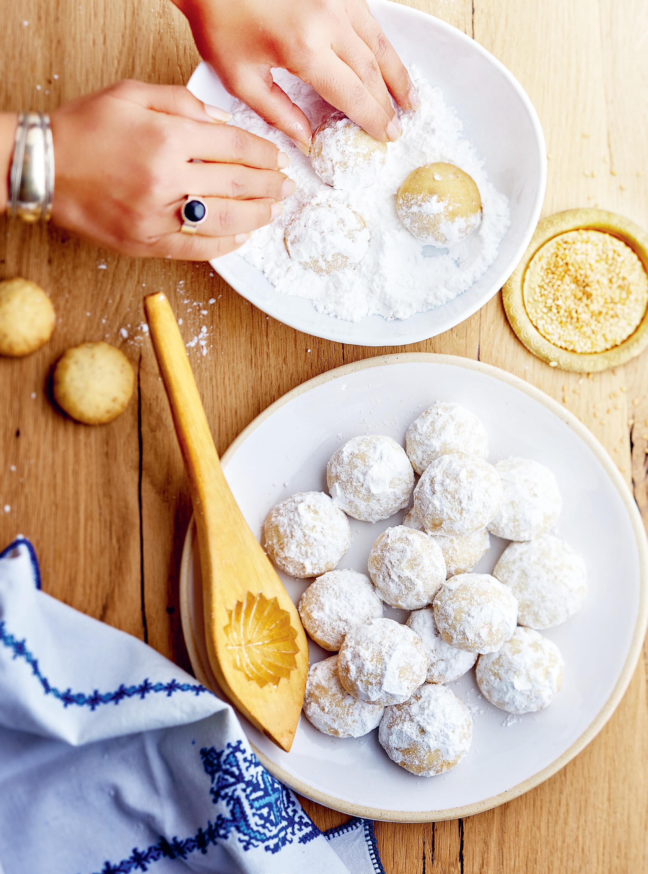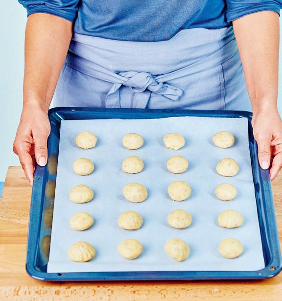 Façonnez des boulettes de la taille d’une noix. Disposez-les sur une plaque à pâtisserie recouverte de papier sulfurisé, en les espaçant. Enfournez et faites cuire 20 minutes environ jusqu’à ce que les sablés soient légèrement dorés. Laissez-les tiédir 5 minutes.