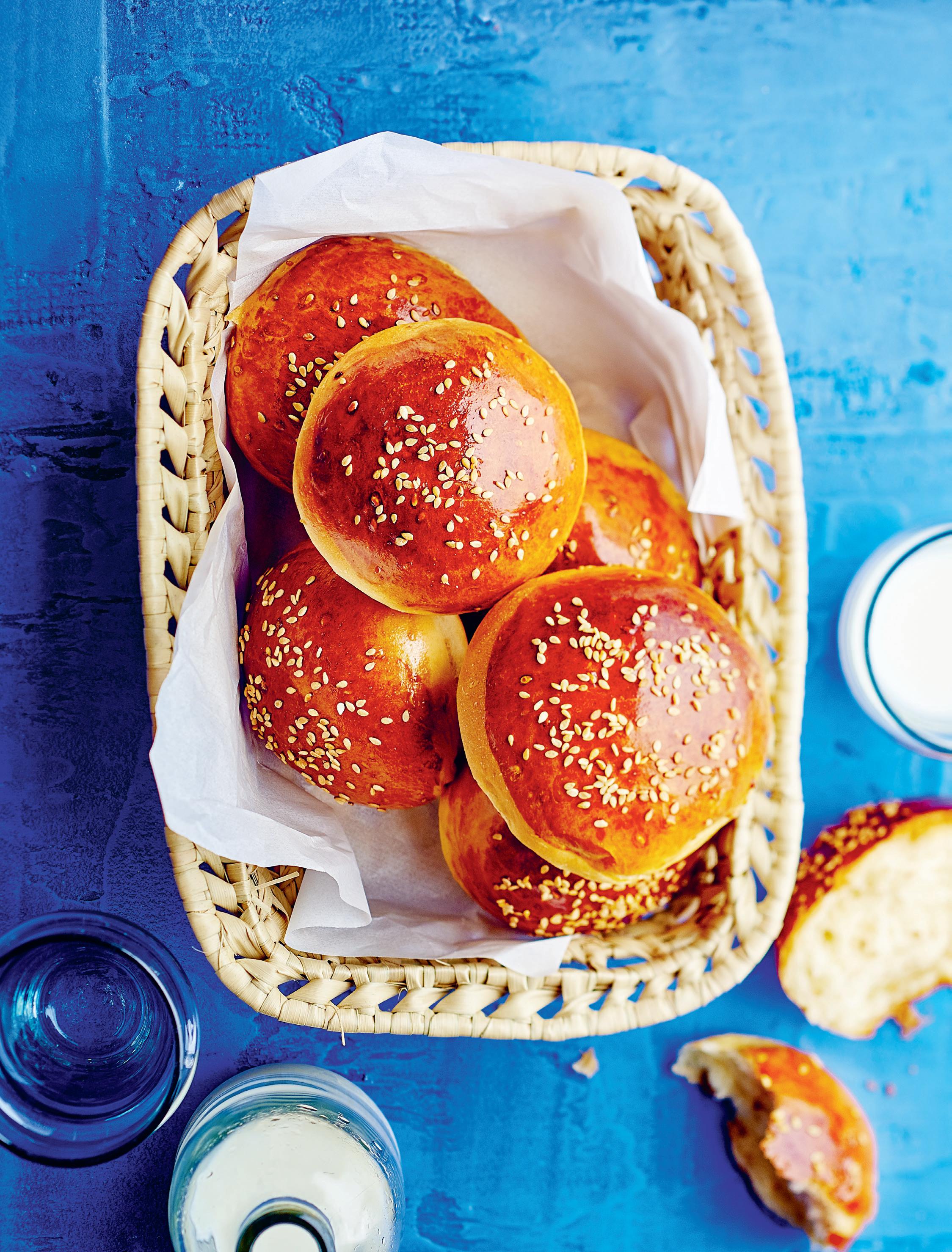Formez une boule de pâte et déposez-la dans le saladier. Couvrez-la avec un torchon propre et laissez-la gonfler 1 heure à l’abri des courants d’air. Déposez la boule sur le plan de travail fariné et façonnez 10 pâtons égaux. Laissez-les reposer 10 minutes. Avec chaque pâton, formez une boule. Disposez les boules sur une plaque à pâtisserie recouverte de papier sulfurisé. Couvrez-les et laissez-les lever 40 minutes environ.