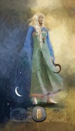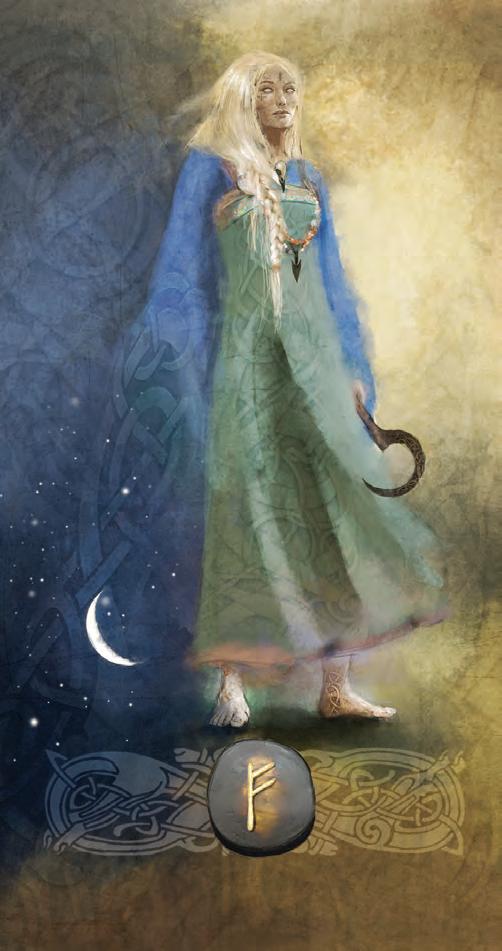 • Poème : gerbes d’or, corbeilles au cœur des vergers, Fehu dispense, égraine, chante. Elle est fille-lune, de moisson et d’hydromel.