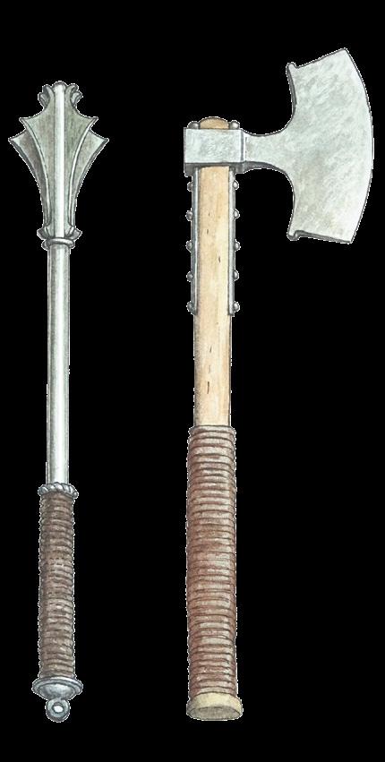 n plus d’une épée, les chevaliers emploient d’autres armes. Certains aiment se servir d’une masse d’armes. À l’origine, c’était un simple gourdin muni d’une tige de fer pointue. Peu à peu, on la forge entièrement en métal. L’extrémité est alors hérissée de plusieurs pointes. Le fléau est une masse d’armes articulée sur une chaîne. La lance est une longue hampe terminée par un fer pointu. D’autres combattants préfèrent la hache, plus ou moins grosse selon la musculature du combattant. Certaines haches ont une pointe recourbée à l’arrière : elle sert à désarçonner l’adversaire.