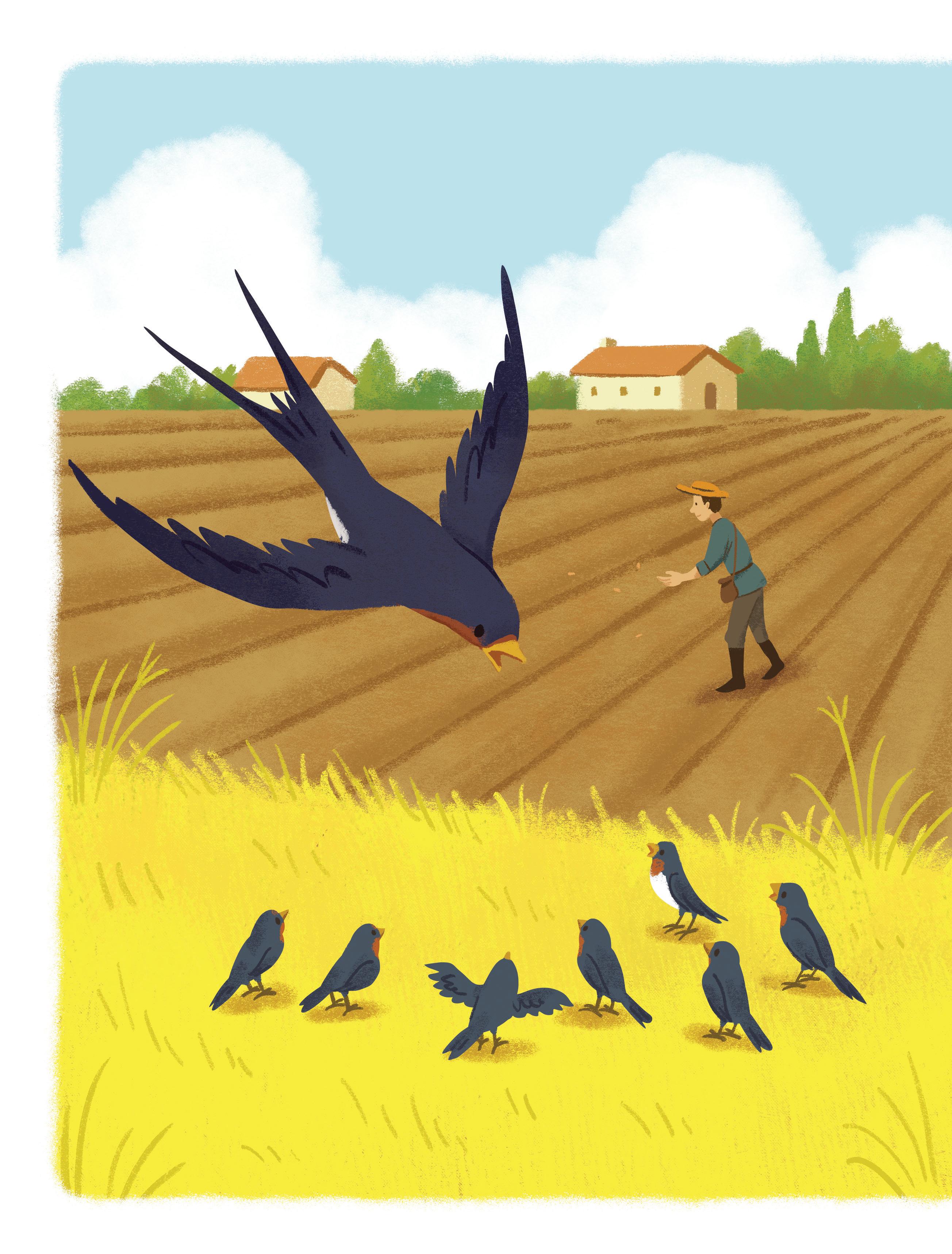 À ces mots le Corbeau ne se sent pas de joie ; Et pour montrer sa belle voix, Il ouvre un large bec, laisse tomber sa proie.