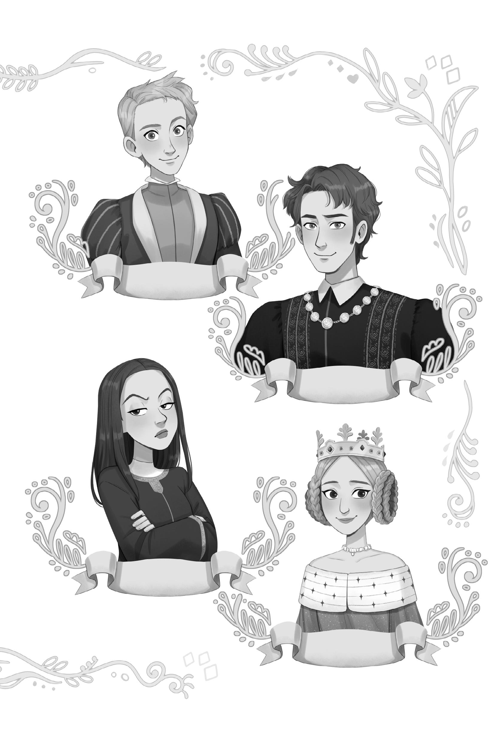 Sans laisser à ses amis le temps de se moquer de sa dernière remarque, elle leur montra un jeune garçon, qui devait avoir 13 ou 14 ans, et venait d’entrer dans la cour d’honneur. Il avait en effet fort belle allure, sur son magnifique cheval noir : ses cheveux blonds, bouclés, lui tombaient en cascade sur les épaules et son regard bleu glacier balayait la foule d’un air amusé dans lequel pointait un soupçon de morgue. Un petit garçon d’environ 8 ans, qui semblait être son double en miniature, chevauchait à ses côtés. L’air sûr de lui, il jetait par moments des coups d’œil au jeune seigneur et calquait son attitude sur la sienne, dans un jeu de miroir qui fit sourire Hermance. Ils étaient entourés d’une suite nombreuse – écuyers, serviteurs, pages – qui caracolait derrière eux.