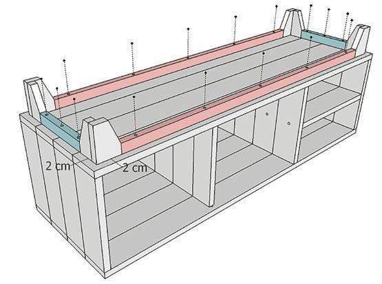 2. Collez et vissez l’assemblage obtenu à l’un des 2 panneaux mesurant 120 × 38 × 2 cm (en rouge). Effectuez le vissage sous le panneau, c’est-à-dire sur la face où se trouvent les vissages en biais. Utilisez des vis 4 × 50 mm. Voir schéma 4