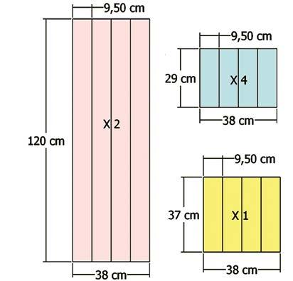 1. Assemblez 4 à 4 les planches mesurant 120 × 9,5 × 2 cm (en rouge) pour former 2 pan neaux mesurant 120 × 38 × 2 cm (en rouge). Bouchez les trous d’assemblage n’est pas néces saire, car ils seront cachés lors de la fabrication du caisson. Voir schéma 1