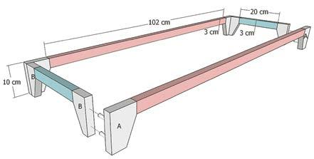 1. Assemblez la planche mesurant 102 × 3 × 2 cm (en rouge) avec 2 éléments A en les collant et vissant avec le système de vis en biais. Utilisez des vis 4 × 30 mm. Fabriquez ainsi 2 éléments identiques. Voir schéma 5 Assemblez la planche mesurant 20 × 3 × 2 cm (en bleu) avec 2 éléments B en les collant et vissant avec le système de vis en biais. Utilisez des vis 4 × 30 mm. Fabriquez ainsi 2 éléments identiques. Voir schéma 5