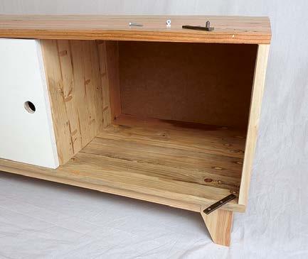 2. À l’arrière du meuble, placez les planches de médium au fond des 2 compartiments fermés par les portes blanches. Maintenez-les avec des rondelles vissées dans le bois et positionnées de façon à déborder sur le médium. Utilisez des vis 4 × 25 mm. Fixez en faisant quelques points de colle chaude au pistolet à colle.