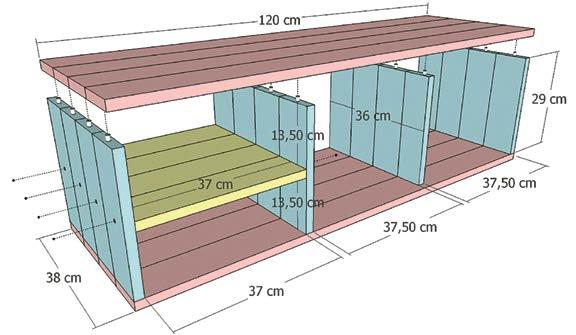 4. Redécoupez la dernière planche mesurant 29 × 38 × 2 cm (en bleu) en enlevant 2 cm pour qu’elle mesure 29 × 36 × 2 cm. Vissez-la à la planche mesurant 120 × 38 × 2 cm (en rouge), en la positionnant comme indiqué sur le schéma 4 . Effectuez le vissage sous le panneau représenté en rouge en utilisant des vis 4 × 50 mm.