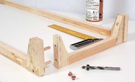 2. Assemblez ensuite les 4 éléments constituant le pied en collant avec des tourillons. Arasez, si nécessaire, les tourillons à l’aide d’une scie. Bouchez les trous avec de la pâte à bois et laissez sécher. Poncez avec un papier abrasif grain 80 puis 120. Passez 2 couches de vernis incolore satiné.