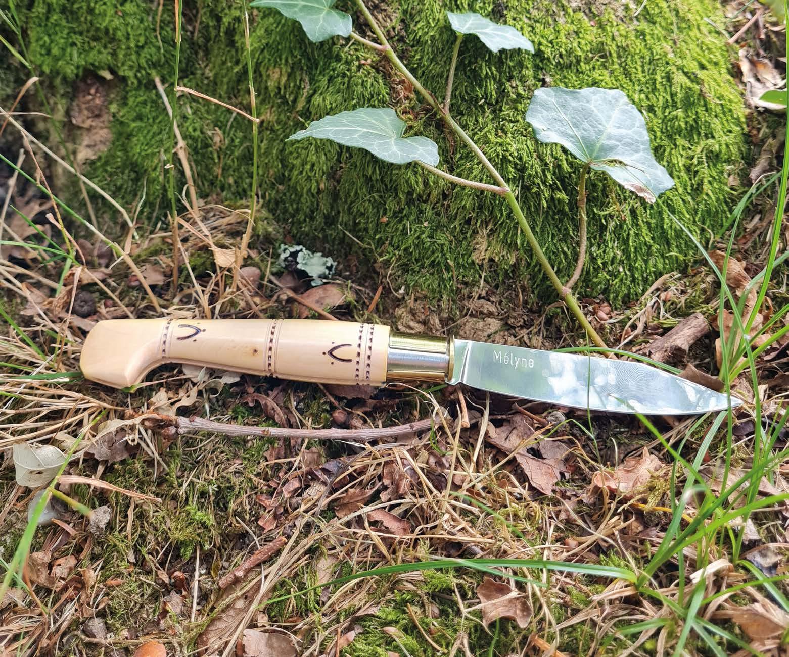 1/ Poncez le manche en bois du couteau pour retirer le vernis, 2/ Sculptez ou pyrogravez un pentagramme sur le bois du manche, 3/ Peignez ou cirez en blanc le bois du couteau, 4/ Laissez sécher (selon le temps indiqué sur votre peinture ou cire).