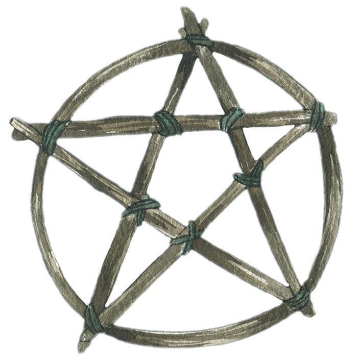 Un pentacle est un disque représentant une étoile et utilisé lors des rituels de consécration. C’est également un élément essentiel de l’autel. Vous pourrez en trouver dans les magasins ésotériques, mais c’est un outil très simple à fabriquer soimême. En magie Wicca, chacune des branches représente un élément. En partant du haut et dans le sens des aiguilles d’une montre, se succèdent : l’esprit, l’eau, le feu, la terre et l’air.