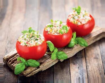 • Décalottez et évidez les tomates pour les farcir avec la préparation. Replacez les chapeaux sur les tomates et saupoudrez l’ensemble avec le reste de persil simple.