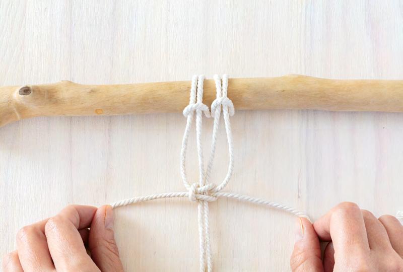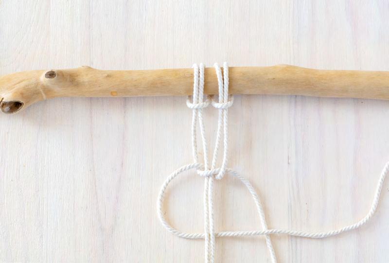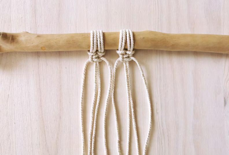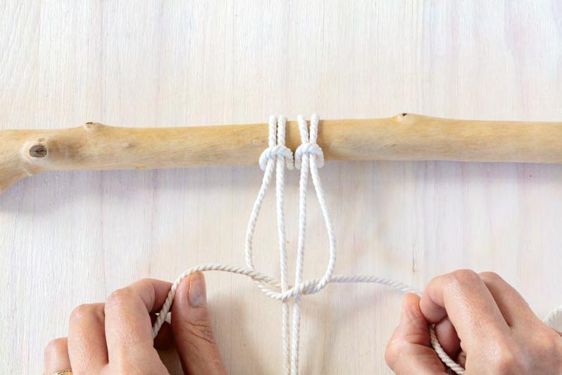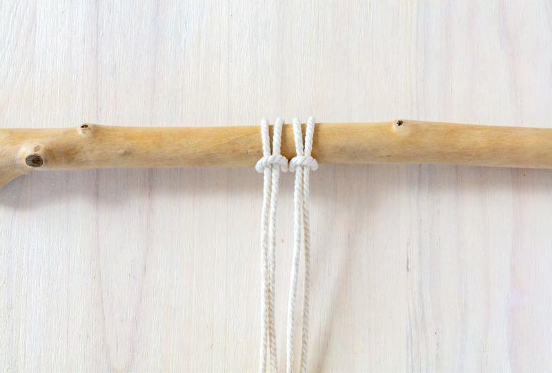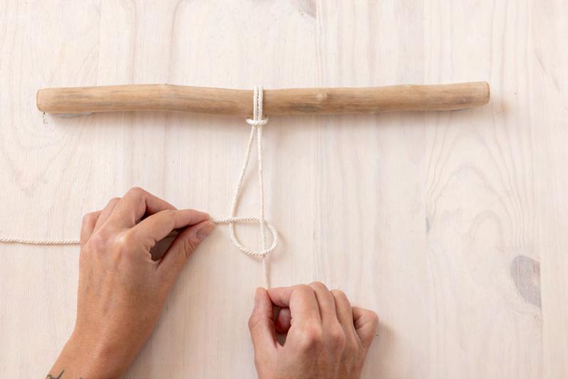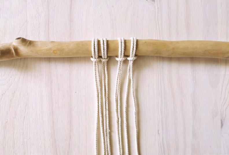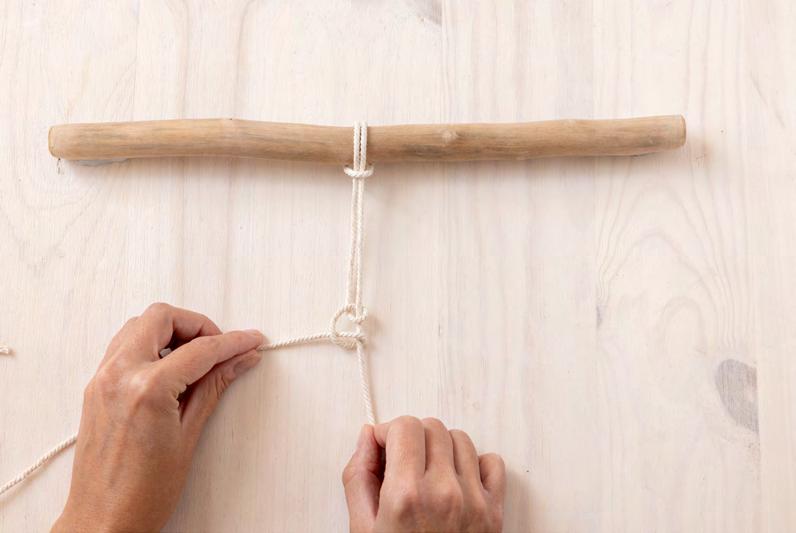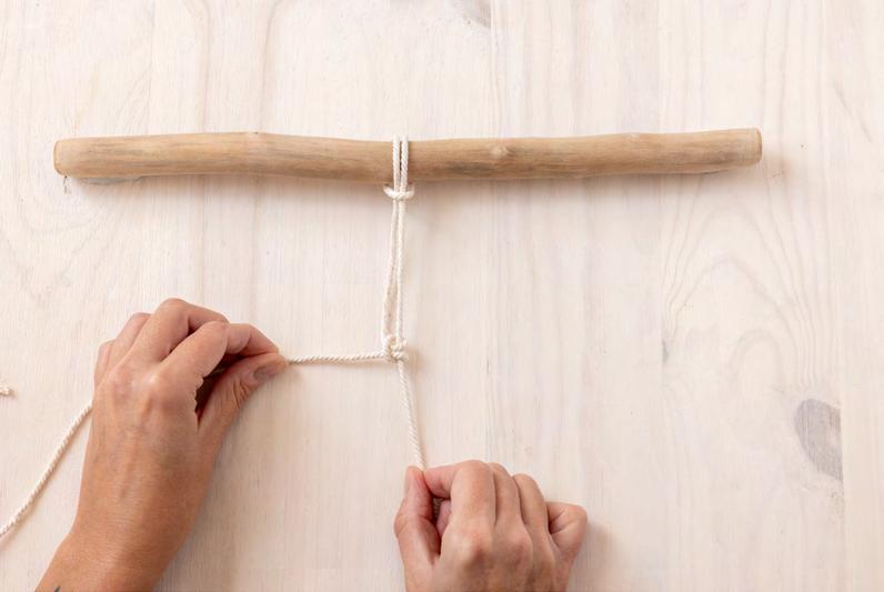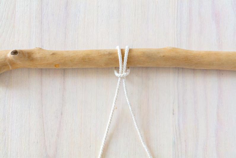 Attachez 4 cordes au support, en formant des nœuds en tête d’alouette.